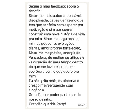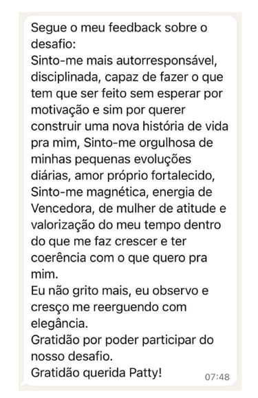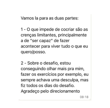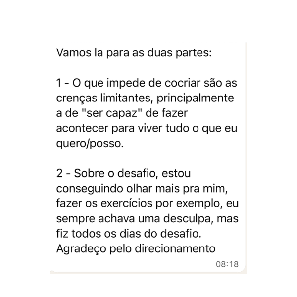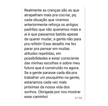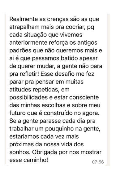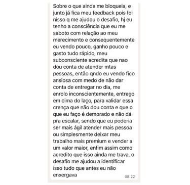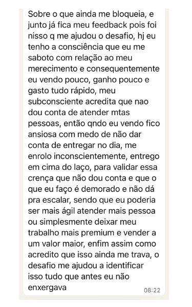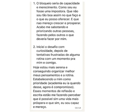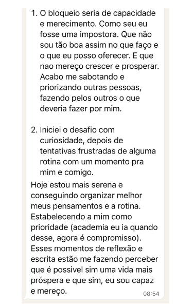 Descobri que meu bloqueio era de capacidade e merecimento. Como se eu fosse uma impostora. O desafio me ajudou a identificar isso que antes eu não enxergava.